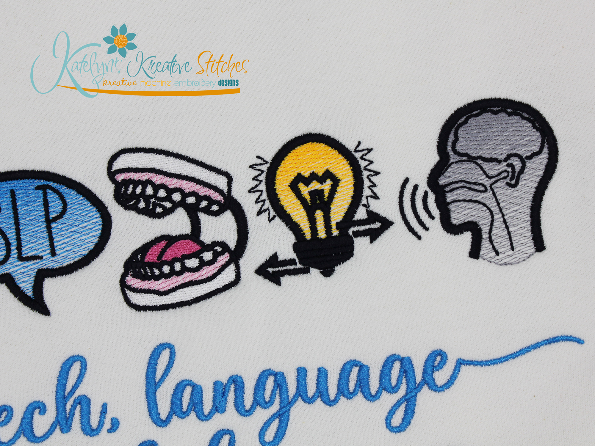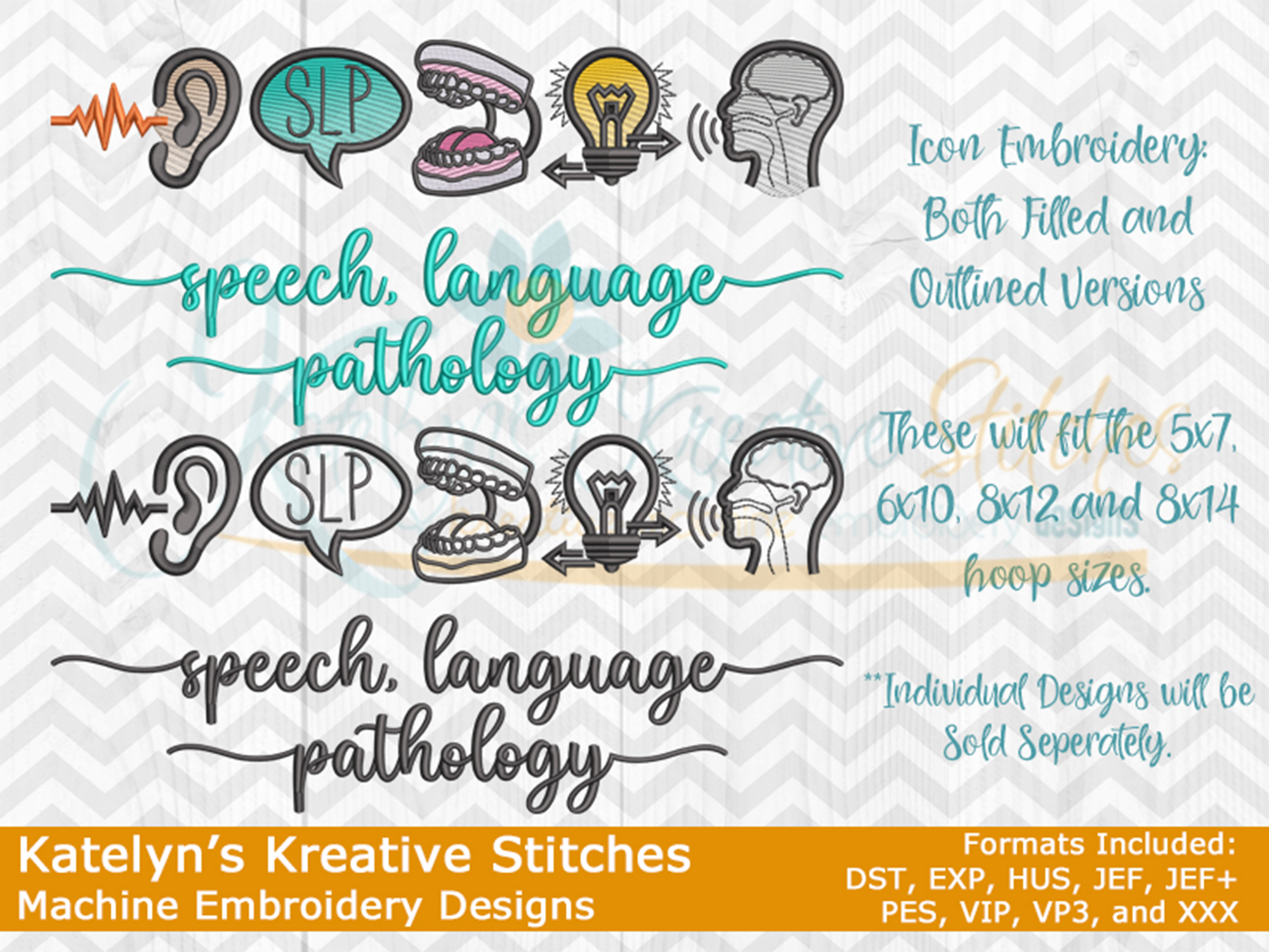 Our Speech, Language, Pathology icon embroidery designs will come in two versions. One will be a mutli colored fill stitch and the other will be a single colored satin outline. These designs will fit the 5x7, 6x10, 8x12 and 8x14 hoop sizes. It "does not" include the 4x4 size, however you can purchase the designs separately in smaller sizes, so they can be hooped individually.