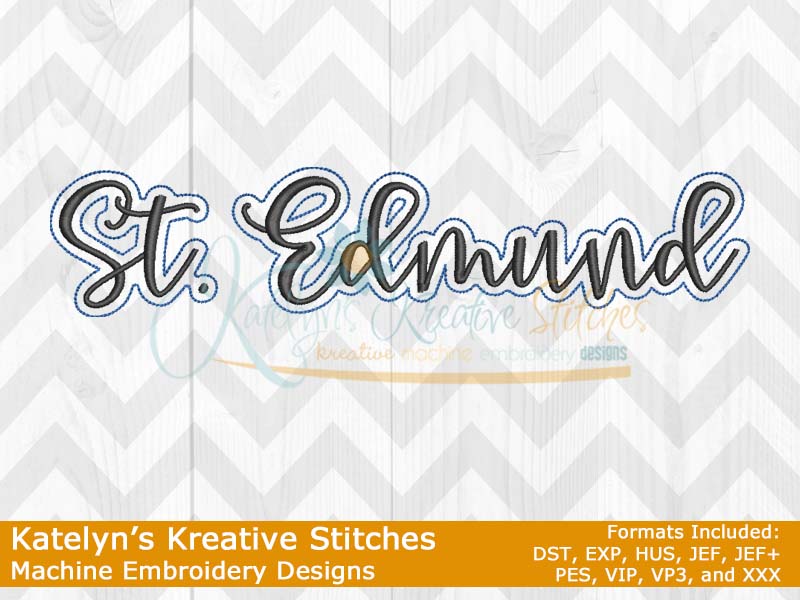 Our St. Edmund Script will come in 5 sizes for a quick and simple stitch out. They will fit the 4x4, 5x7, 6x10, 8x12 and 8x14 hoop sizes. These will be great for tees, sweatshirts, hoodies, blankets, bags and much more. The 4x4 size will be perfect for polo's. Please refer to your .pdf files for design layout and color chart. Each step is labeled on the .pdf files.