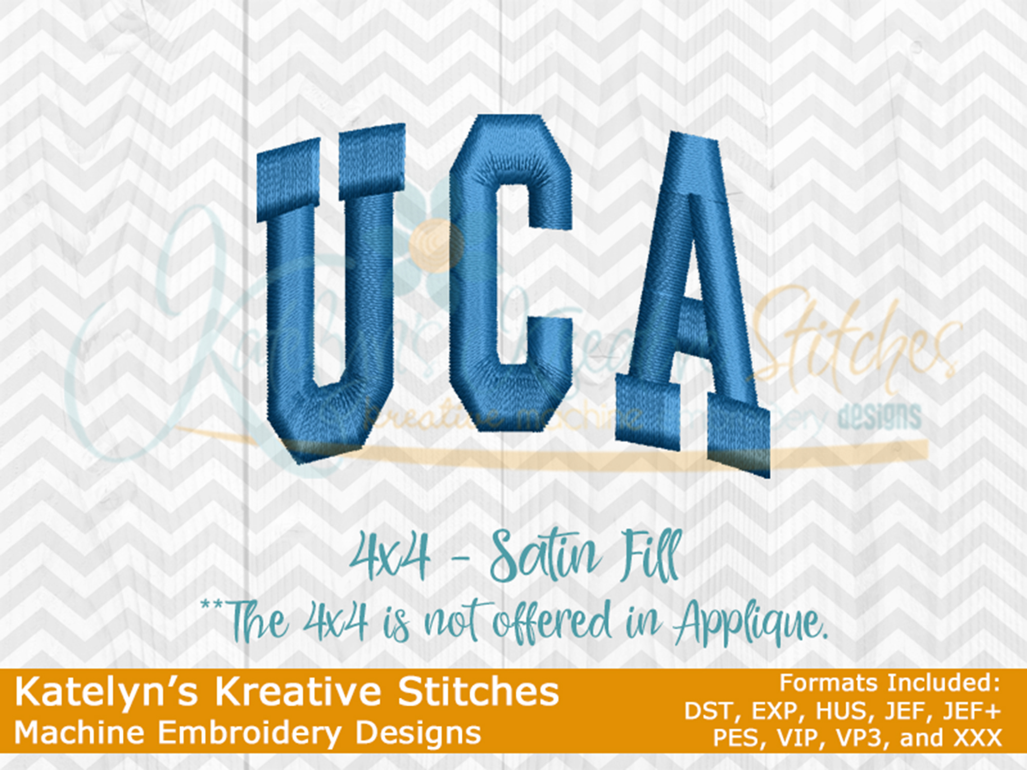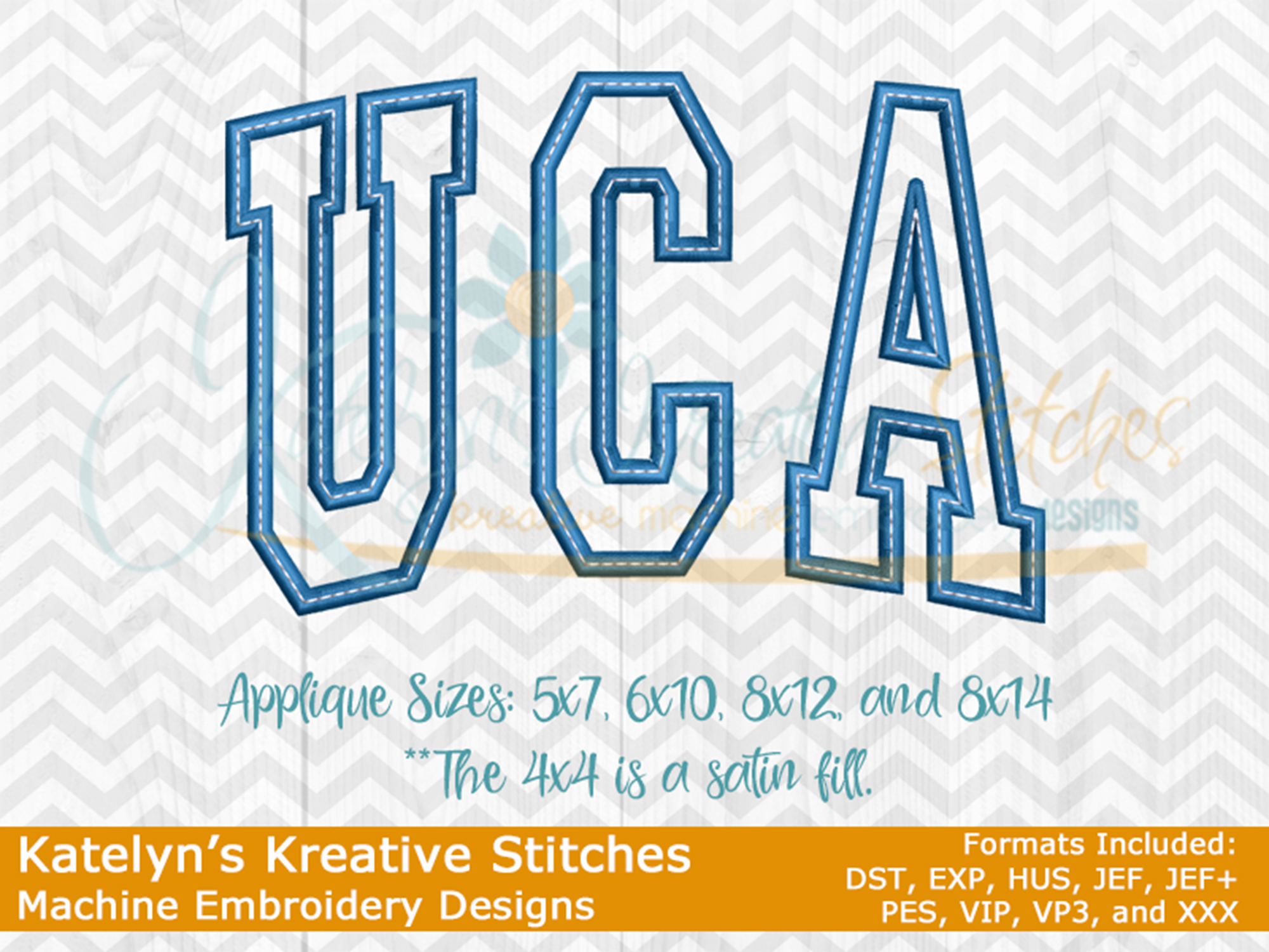 Our UCA arched embroidery design will come in 5 sizes. The 5x7, 6x10, 8x12 and 8x14 will be applique. The smaller 4x4 size will be in a satin stitch. These will be great for school sweatshirts and tees. The 4x4 size will be perfect for polo's too.