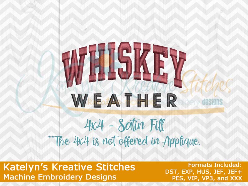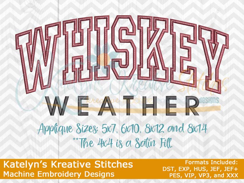Our Whiskey Weather design will come in 5 sizes. The 5x7, 6x10, 8x12 and 8x14 will be applique. The smaller 4x4 size will be in a satin stitch. These will be great for fall and winter sweatshirts. The 4x4 size will be perfect for the pocket area of a sweatshirt.