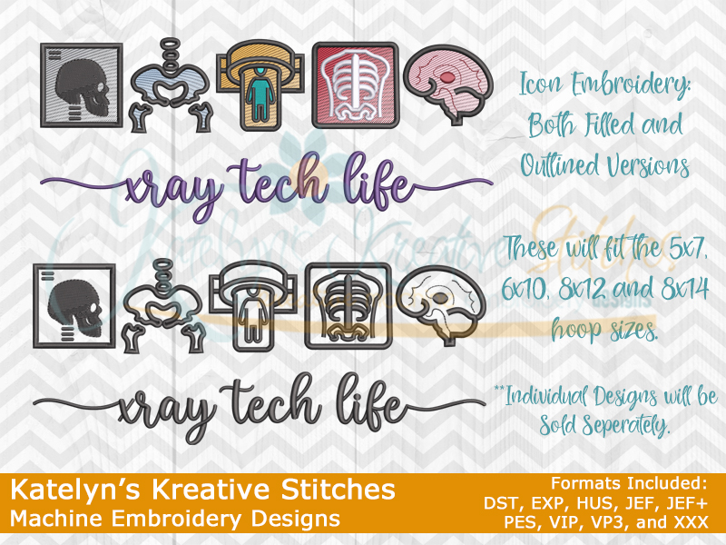 Our XRay Tech Life icon embroidery designs will come in two versions. One will be a mutli colored fill stitch and the other will be a single colored satin outline. These designs will fit the 5x7, 6x10, 8x12 and 8x14 hoop sizes. It "does not" include the 4x4 size, however you can purchase the designs separately in smaller sizes, so they can be hooped individually.