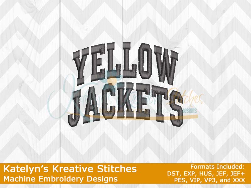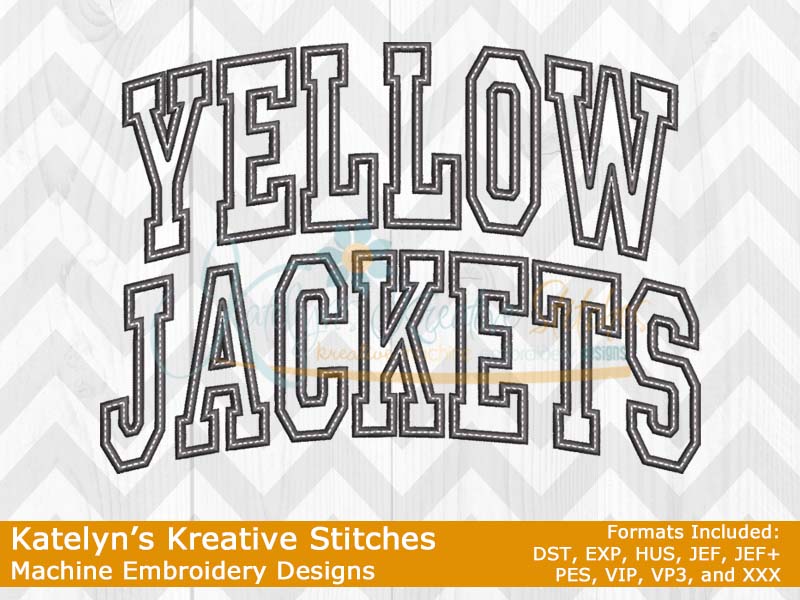 Our Arched Mascot designs will come in 5 sizes. Â The 5x7, 6x10, 8x12 and 8x14 will be applique. Â The smaller 4x4 size will be in a satin stitch. Â These will be great for school sweatshirts and tees. Â The 4x4 size will be perfect for polo's too.